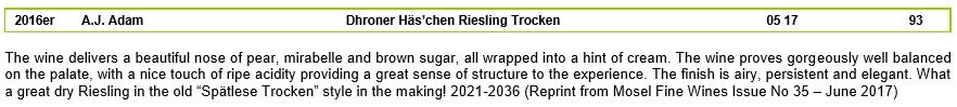 Hallo Daniel,Moselglück hat geschrieben:Schau mal in die aktuelle Mosel Fine Winesbordeauxlover hat geschrieben:Dann habe ich blind einen 12er Karton trockenen Dhroner 2016 bestellt - sowas mache ich höchst selten. Heute die erste Flasche aufgemacht - für mich ein absoluter Knaller, wunderbar cremige Textur, Zug und unglaublicher Trinkfluss, man will das Glas kaum absetzen, und das alles bei bescheidenen 11% Alk. Da denke ich nach der ersten Flasche schon an Nachbestellung - und ich kaufe sehr selten mehr als 12 Flaschen von einem Wein, weil es einfach zu viele gute Weine gibt.