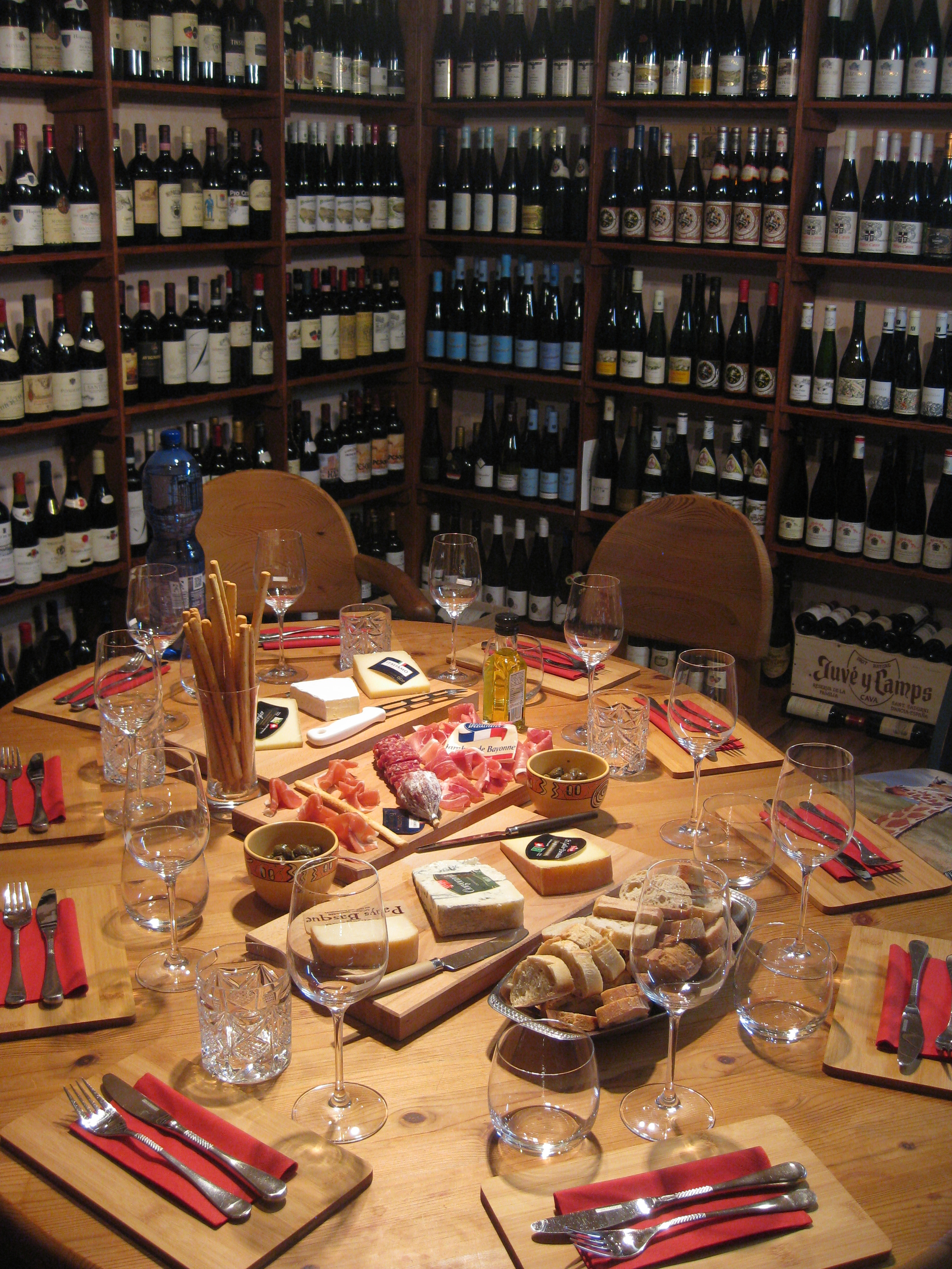Preis 26,- inkl. 6 Käsesorten, Wein, Wasser, Baguette, Salami, Schinken, Grissini u. Oliven.