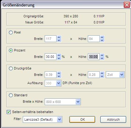 oder die Freeware FastStone Image Viewer. Nach dem Installieren einfach gewünschtes Foto öffnen, rechte Maustaste, "bearbeiten" und "Grösse verändern" wählen.