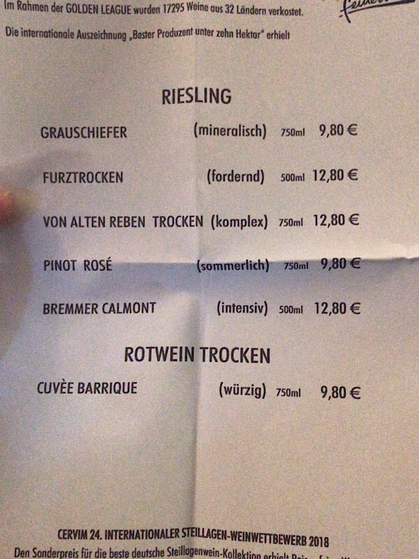 - Bremmer Calmont (dürfte halbtrocken sein, ein Erlebnis) 500ml